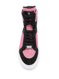 Money Beast high-top sneakers Black and pink leather Money Beast high-top sneakers from Philipp Plein featuring a round neck, a panelled colour block design, crystal embellishments, a lace-up front fastening, a front logo plaque, a logo patch at the tongue and a white rubber sole. Made in Italy Composition Outer: Calf Leather 100%, Goat Skin 100%, Metal 100% Lining: Calf Leather 100% Sole: Rubber 100% SIZE & FIT Measurement HEEL 1.37 in(3.5 cm) HEIGHT 5.51 in(14 cm) Sole height 0.98 in(2.5 cm)