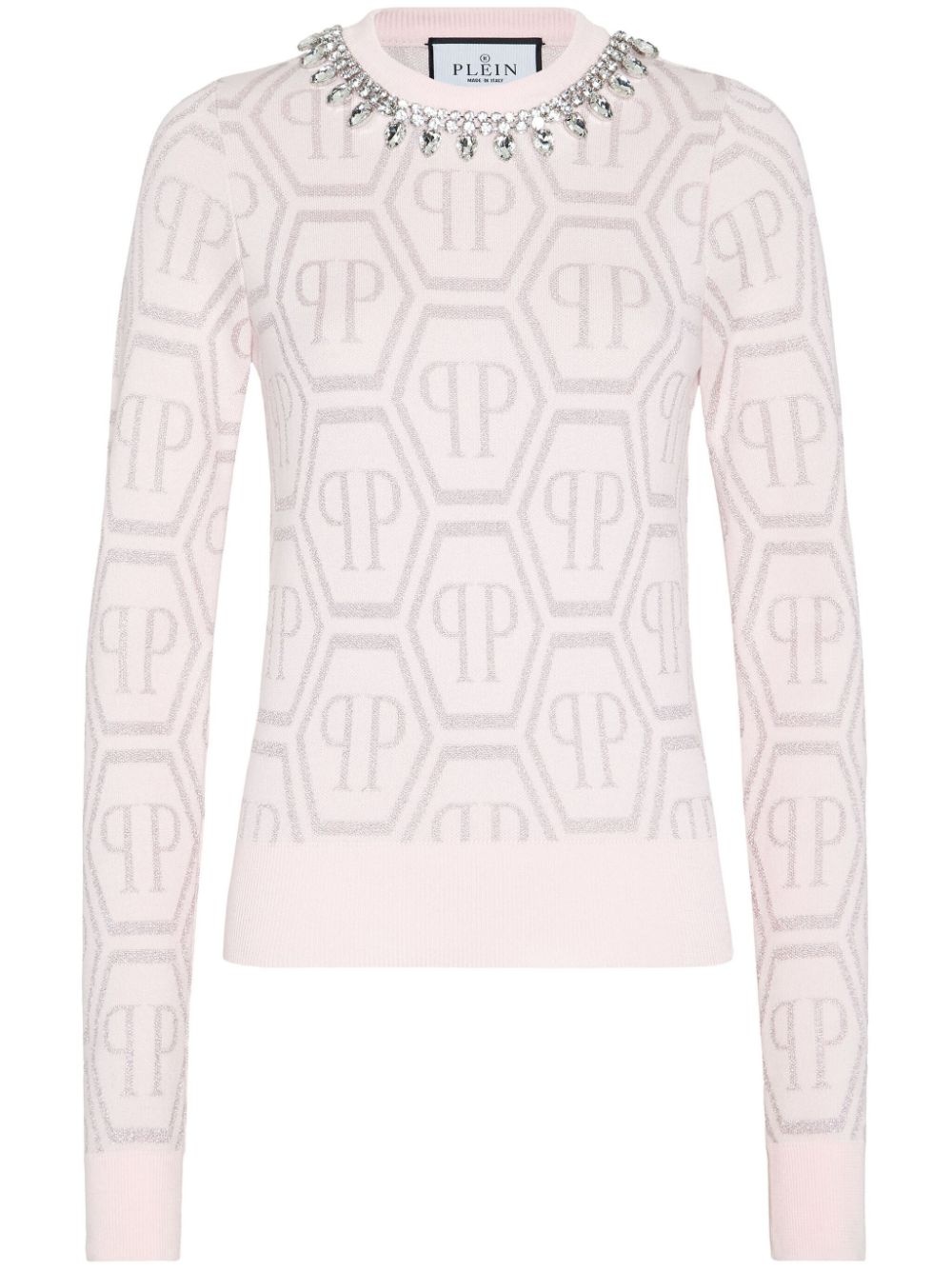 monogram crystal-embellished jumper Highlights - Light pink - Cotton blend - Monogram pattern - Fine knit - Crew neck - Crystal embellishment - Long sleeves - Ribbed trim - Straight hem Made in Italy Composition Cotton 60%, Acetate 31%, Metallized Polyester 5%, Nylon 4%