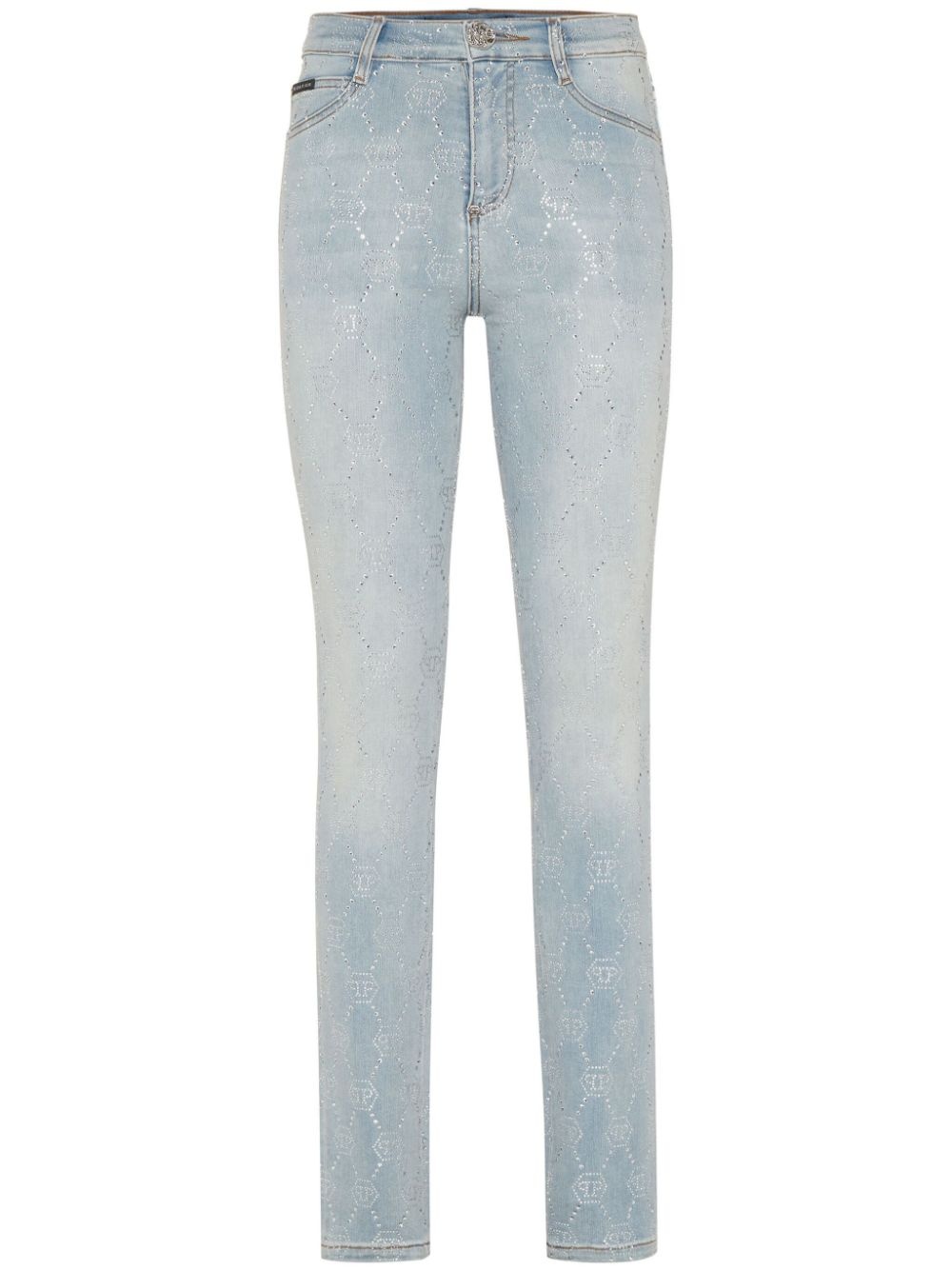 monogram high-waisted jegging trousers Highlights - Light blue - Denim - Monogram pattern - Front button and zip fastening - High-waisted - Belt loops - Classic five pockets - Logo patch to the rear Imported Composition Polyester 100%, Glass Fiber 100%, Cotton 92%, Elastomultiester 6%, Elastane 2%