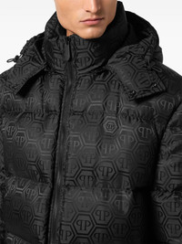monogram-jacquard padded jacket Highlights - Black - Goose down - Monogram jacquard - Padded design - Front zip fastening - Detachable drawstring hood - Stand-up collar - Applique logo - Long sleeves - Ribbed cuffs - Two side zip-fastening pockets Imported Composition Outer: Polyamide 100% Lining: Polyester 100%, Goose Down 90%, Goose Feather 10%