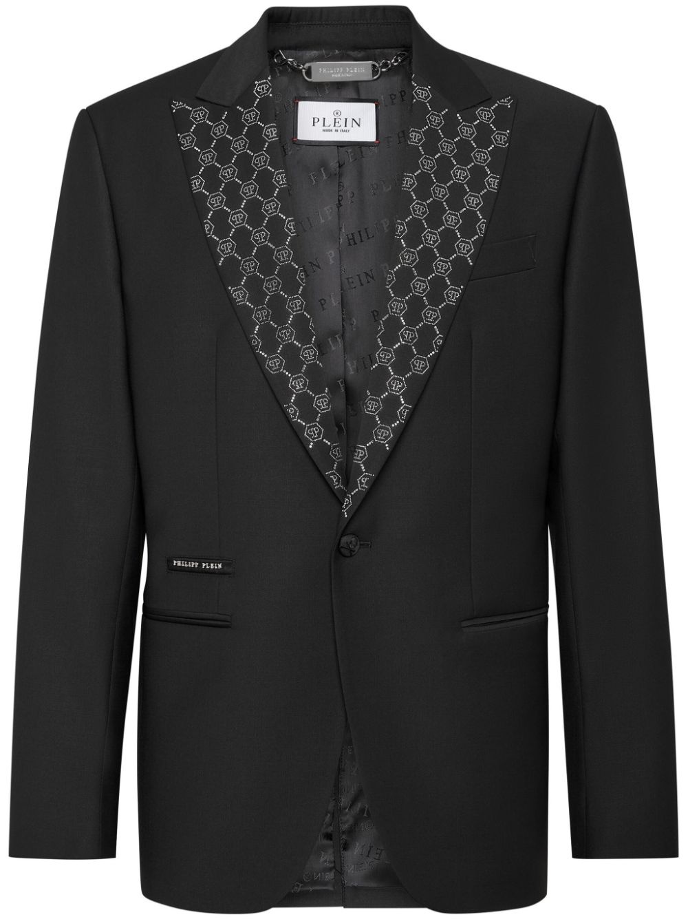 monogram-pattern blazer Highlights - Black/silver-tone - Monogram pattern - Front button fastening - Peak lapels - Rhinestone embellishment - Long sleeves - Jetted chest pocket - Applique logo - Two front welt pockets - Buttoned cuffs - Full lining - Straight hem Made in Italy Composition Lining: Viscose 51%, Acetate 49% Outer: Polyester 53%, Virgin Wool 43%, Elastane 4%