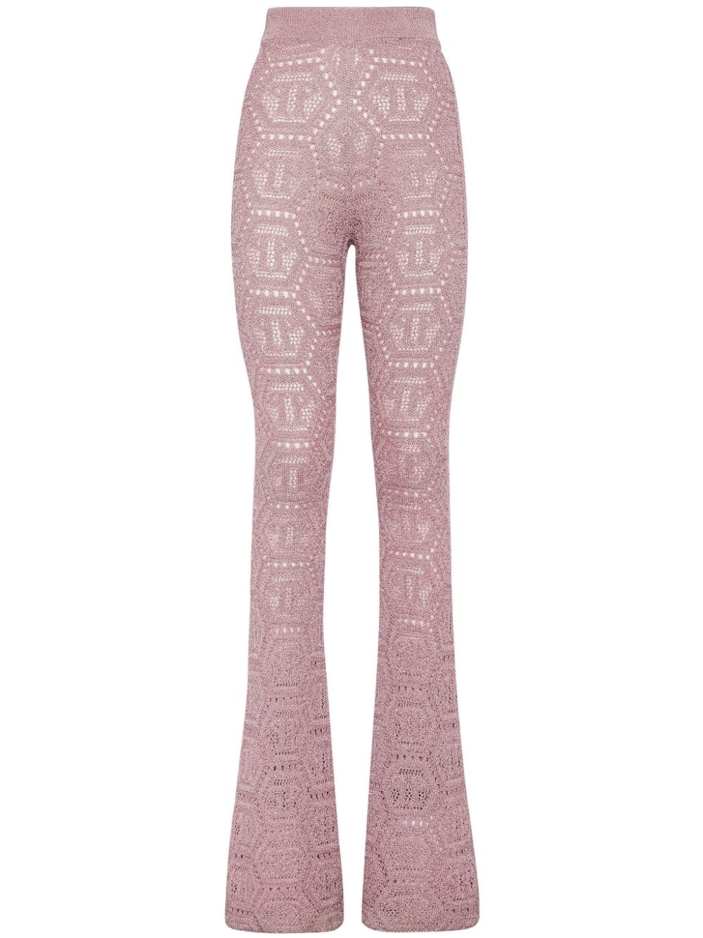monogram-pattern open-knit trousers Highlights - Rose pink - Lurex detailing - Open knit - Monogram pattern - Elasticated waistband - Flared Made in Italy Composition Acetate 78%, Metallized Polyester 12%, Nylon 10%
