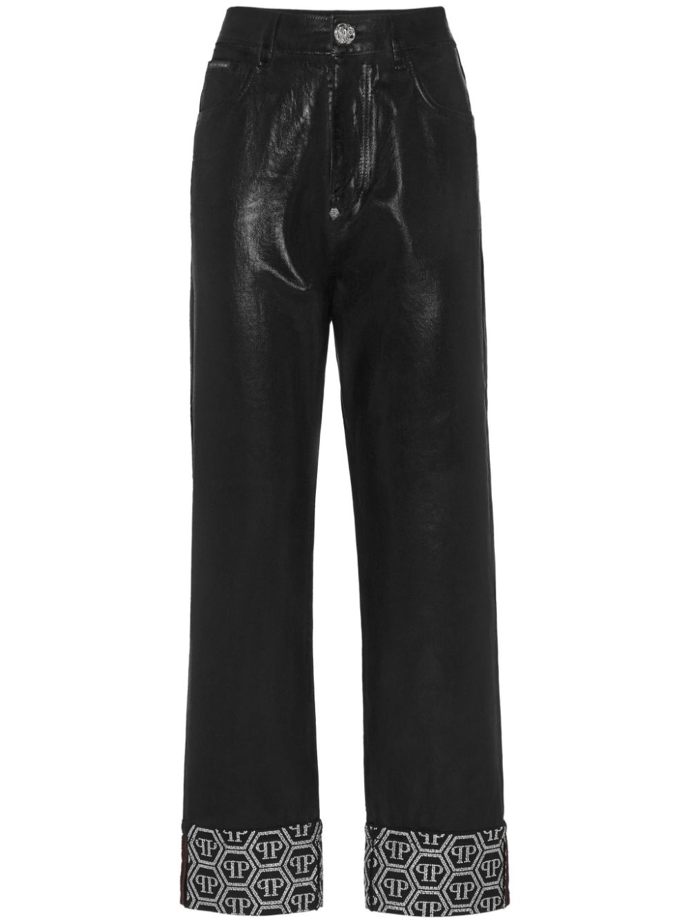 monogram-pattern trousers Highlights - Black/white - Faux leather - Panelled design - Monogram pattern - Front button and zip fastening - Belt loops - High-rise - Classic five pockets - Straight leg Imported Composition Outer: Polyester 100%, Cotton 100%, glass 100% Lining: Polyester 65%, Cotton 35% Washing instructions Read Manufacturer Guidelines