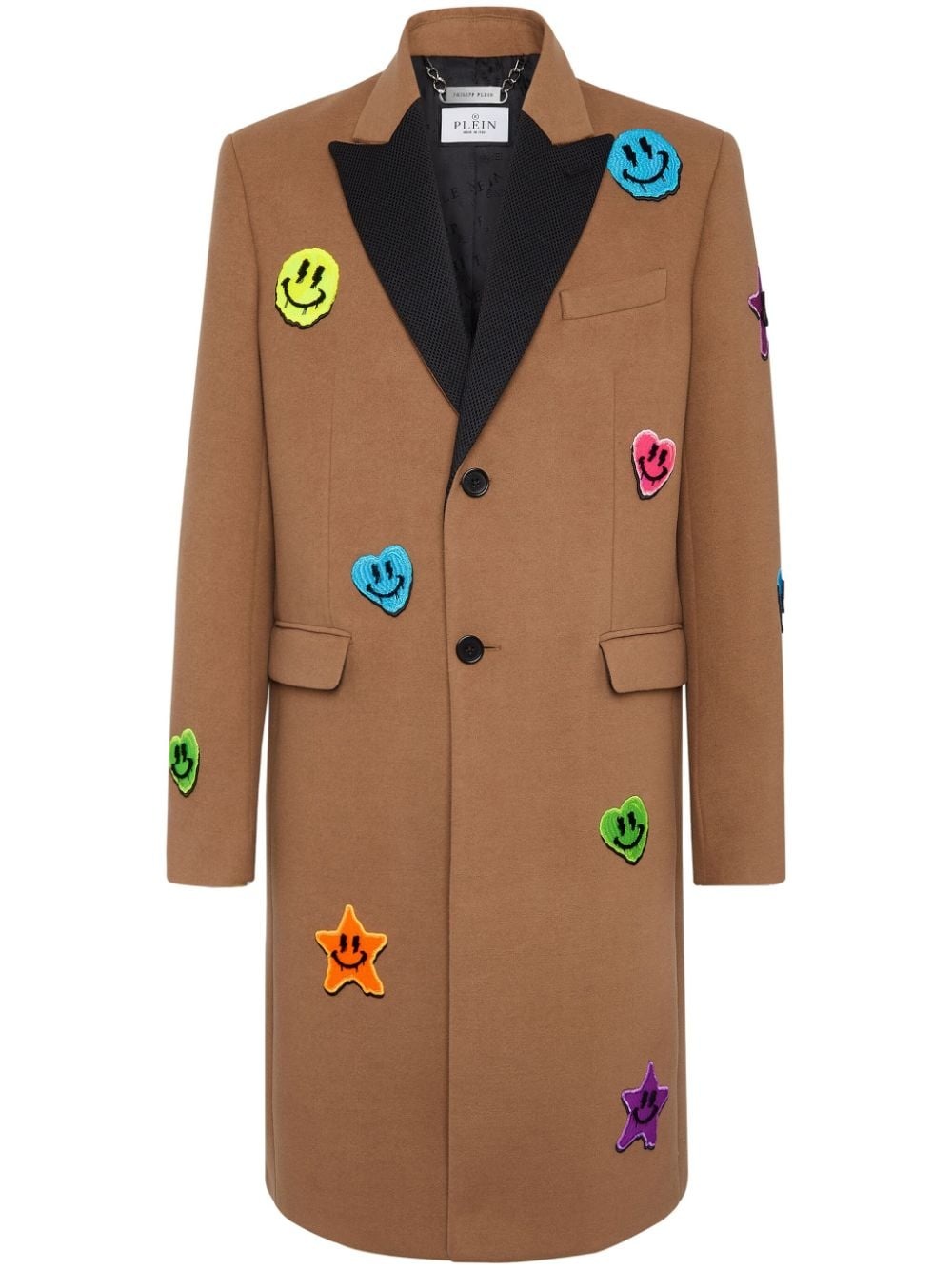 multi-patch single-breasted coat Highlights - Camel brown/multicolour - Virgin wool blend - Applique logo - Smiley face, star, and heart patches - Peak lapels - Contrasting collar - Front button fastening - Long sleeves - Buttoned cuffs - Jetted chest pocket - Two front flap pockets - Straight hem - Knee-length - Logo-jacquard lining Made in Italy Composition Virgin Wool 70%, Polyamide 20%, Cashmere 10% Washing instructions Read Manufacturer Guidelines