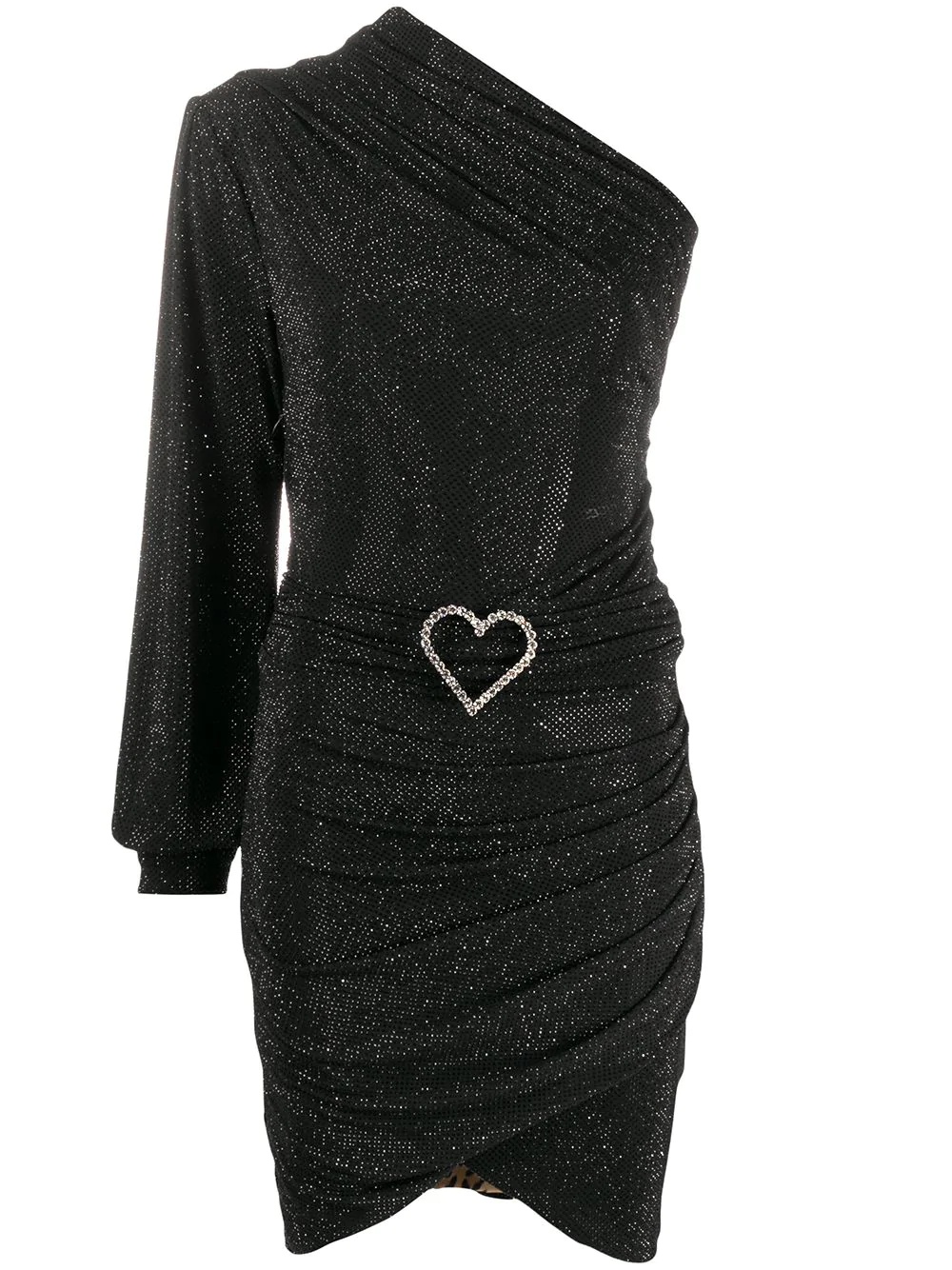 one-shoulder crystal-heart dress Highlights - Black - One shoulder - Metallic threading - Fitted - Ruched detailing - Asymmetric hem - Crystal-heart detail Imported Composition Outer: glass 100%, Polyester 95%, Spandex/Elastane 5% Lining: Polyester 95%, Spandex/Elastane 5% SIZE & FIT Model measurements Height 5 ft 11 in(1.8 m) Bust/Chest 33.07 in(84 cm) Hips 37.4 in(95 cm) Waist 25.19 in(64 cm) FittingInformation This piece fits true to size. We recommend you get your regular size Cut for a close fit Made with a heavyweight stretch fabric Washing instructions Dry Clean Only