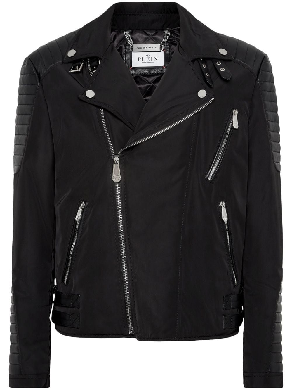 padded-detail leather biker jacket Philipp Plein adds his signature spin to this jacket. The leather construction and biker silhouette contribute to its hard-edged aesthetic. Highlights - Black - Leather - Padded panels - Silver-tone hardware - Notched lapels - Off-centre front fastening - Two side zip-fastening pockets - Long sleeves - Straight hem Imported Composition Nylon 100%, Leather 100%