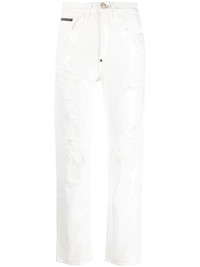 Paillettes Mom-fit distressed jeans white cotton distressed finish logo patch to the rear high-waisted slim cut straight leg front button and zip fastening classic five pockets Made in Italy Composition Outer: Cotton 100%, Polyethylene 70%, Polyamide 30% Lining: Cotton 100% SIZE & FIT Model measurements Height 5 ft 11 in(1.8 m) Bust/Chest 31.88 in(81 cm) Hips 35.03 in(89 cm) Waist 24.01 in(61 cm) FittingInformation This piece fits true to size. We recommend you get your regular size Designed to be fitted at the waist and hips, loose over the leg Made with a mid-weight non-stretch fabric Washing instructions Dry Clean Only