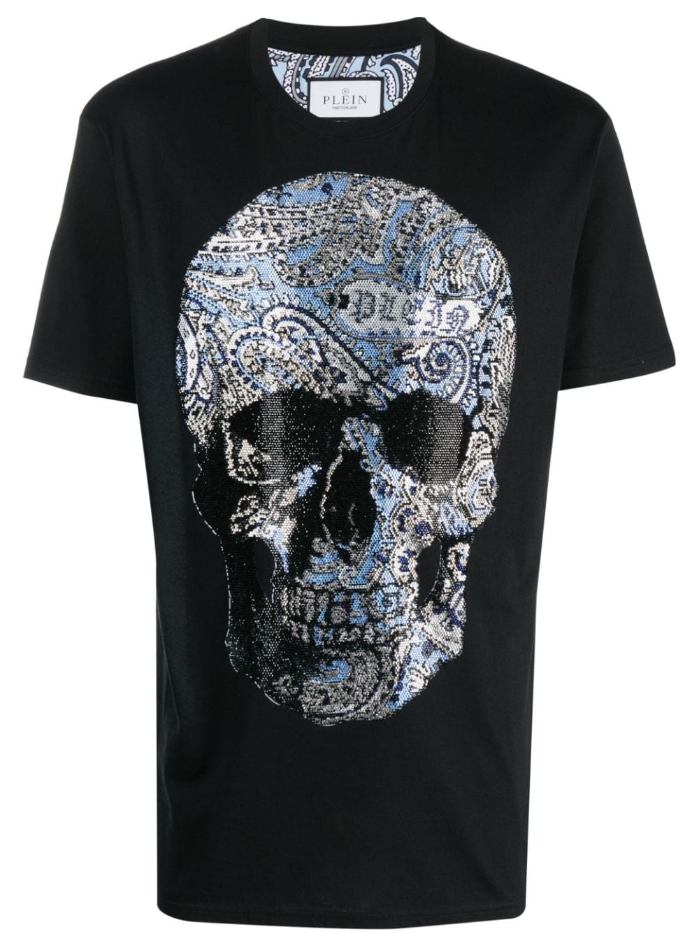paisley skull round neck T-shirt Highlights - Black - Light blue - Skull print to the front - Paisley print - Round neck - Short sleeves - Straight hem Imported Composition Polyester 100% SIZE & FIT Model measurements Height 6 ft 0 in(1.84 m) Bust/Chest 35.82 in(91 cm) Hips 37 in(94 cm) Waist 28.34 in(72 cm) FittingInformation Designed for a relaxed fit, this piece allows for comfort and movement when worn Made from a midweight non-stretch fabric, this piece offers minimal elasticity when worn This piece fits true to size – take your usual size Washing instructions Hand Wash