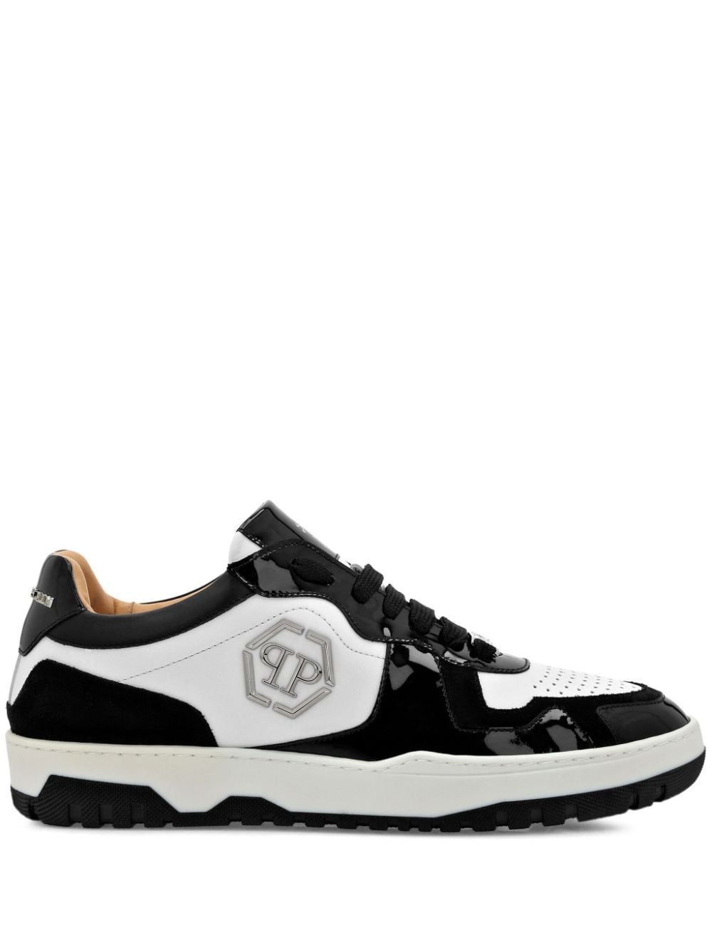 panelled leather sneakers Highlights - White/black - Leather - Patent finish - Round toe - Perforated detailing - Debossed logo to the side - Branded insole - Logo patch at the tongue - Front lace-up fastening - Flat rubber sole - When buying this unisex item, keep in mind that it is graded in standard men's sizing. Made in Italy Composition Leather 100%