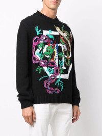 patterned intarsia-knit jumper Philipp Plein's balance of extravagance and opulence is showcased in this long-sleeve jumper with an intarsia design at the front. Blending the brand's logo motif with imagery depicting animals such as an eagle and snake in bright colours, it creates an eye-catching design. Highlights - Multicolour - Wool - Intarsia-knit logo - Patterned intarsia knit - Round neck - Long sleeves - Ribbed detailing - When buying this unisex item, keep in mind that it is graded in standard men's sizing Made in Italy Composition Wool 94%, Polyamide 3%, Viscose 3% SIZE & FIT Model measurements Height 5 ft 10 in(1.78 m) Bust/Chest 33.46 in(85 cm) Hips 36.22 in(92 cm) Waist 23.22 in(59 cm) FittingInformation This piece is unisex. Please take care when selecting your size Cut for a relaxed fit for both men and women Made with a mid-weight fabric