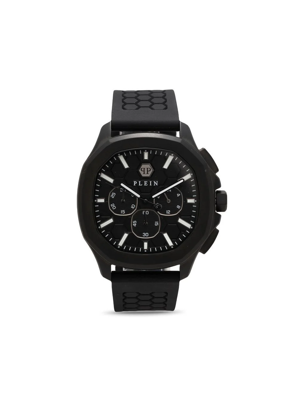 $pectre Chrono 44mm Philipp Plein showcases their geometrical influences with the design of this $pectre Chrono 44mm from SS23. A cushion-shaped case houses a black dial with a hexagonal pattern throughout, which continues across the strap for a textured finish. Imported Composition stainless steel 100% SIZE & FIT Model measurements Height 6 ft 1 in(1.85 m) Bust/Chest 35.82 in(91 cm) Hips 37.79 in(96 cm) Waist 29.13 in(74 cm) Measurement DIAMETER 1.69 in(4.3 cm) Minimum Length 7.08 in(18 cm) Thickness 0.39 in(1 cm) TOTAL LENGTH 9.05 in(23 cm) WIDTH 0.78 in(2 cm)