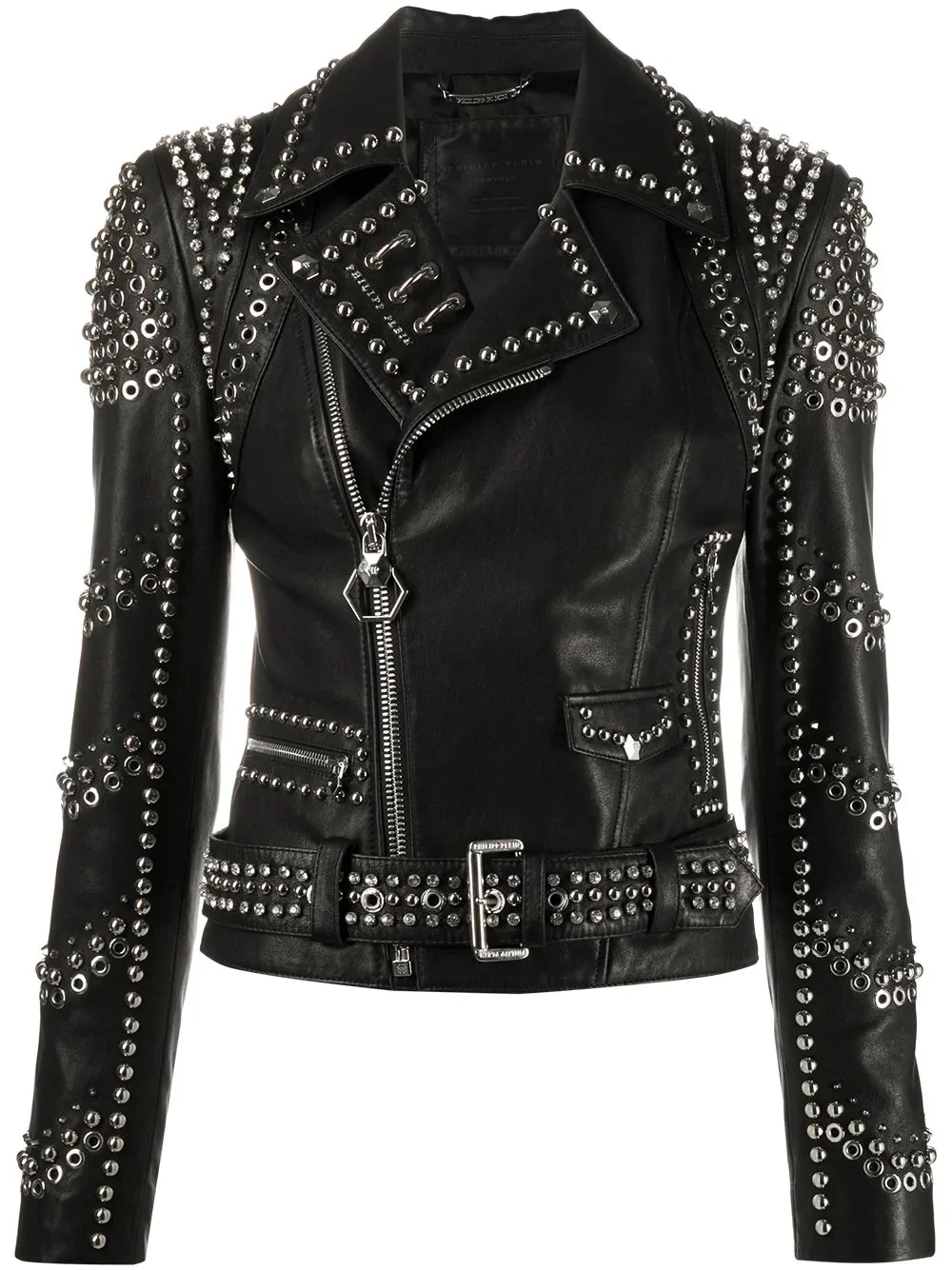 pierced biker jacket Black lambskin pierced biker jacket from Philipp Plein featuring silver-tone stud detailing, eyelets, a front zip pocket, a coin pocket, notched lapels, long sleeves, a belted waist and an off-centre front zip fastening. Imported Composition Outer: Lambskin 100% Lining: Acetate 100% Washing instructions Specialist Cleaning