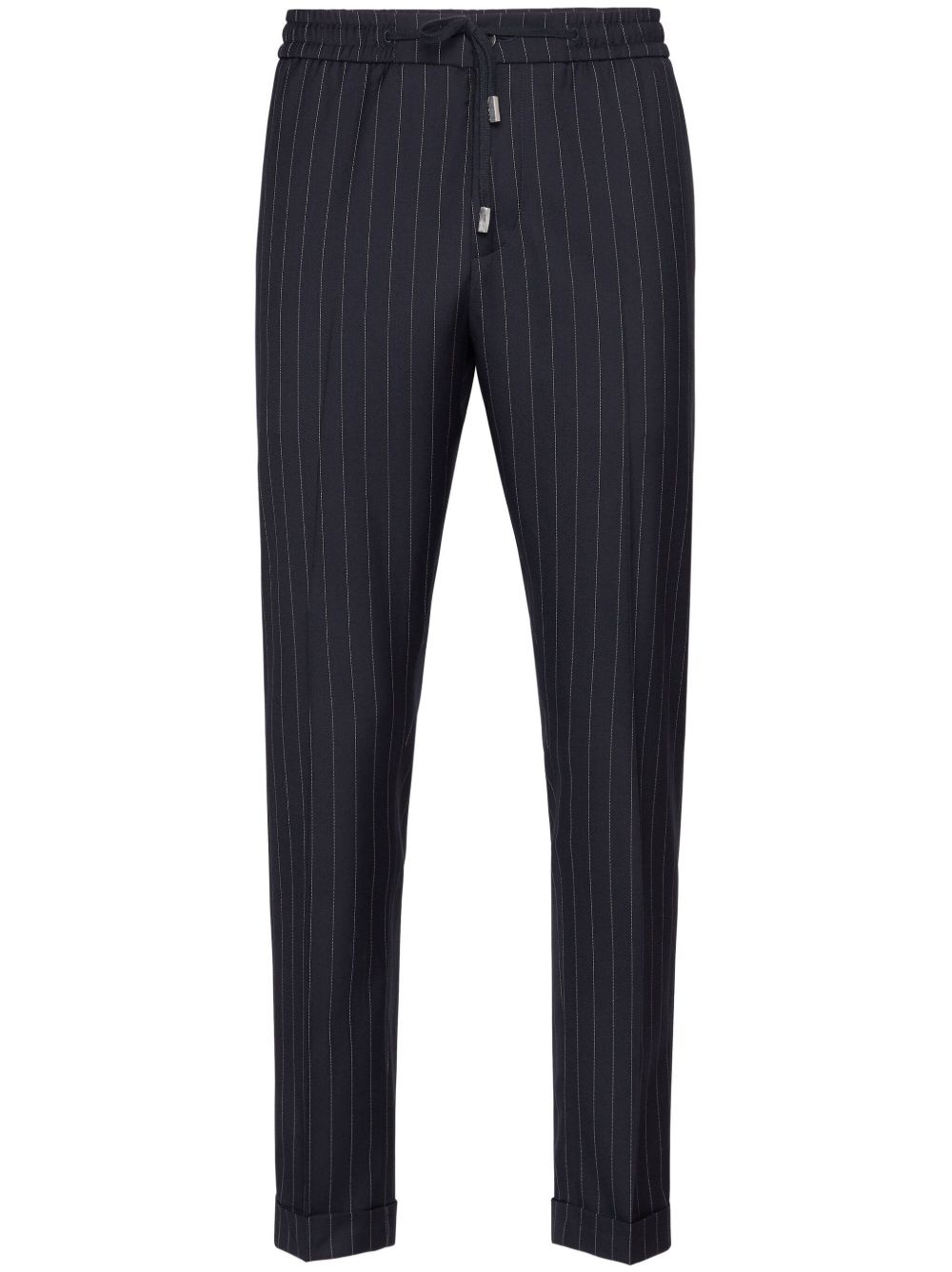 pinstriped track pants Highlights - Navy blue - Concealed front fastening - Drawstring fastening waist - Two side inset pockets - Two rear jetted pockets Made in Italy Composition Lining: Polyamide 65%, Cotton 35% Outer: Virgin Wool 100%