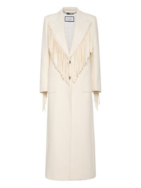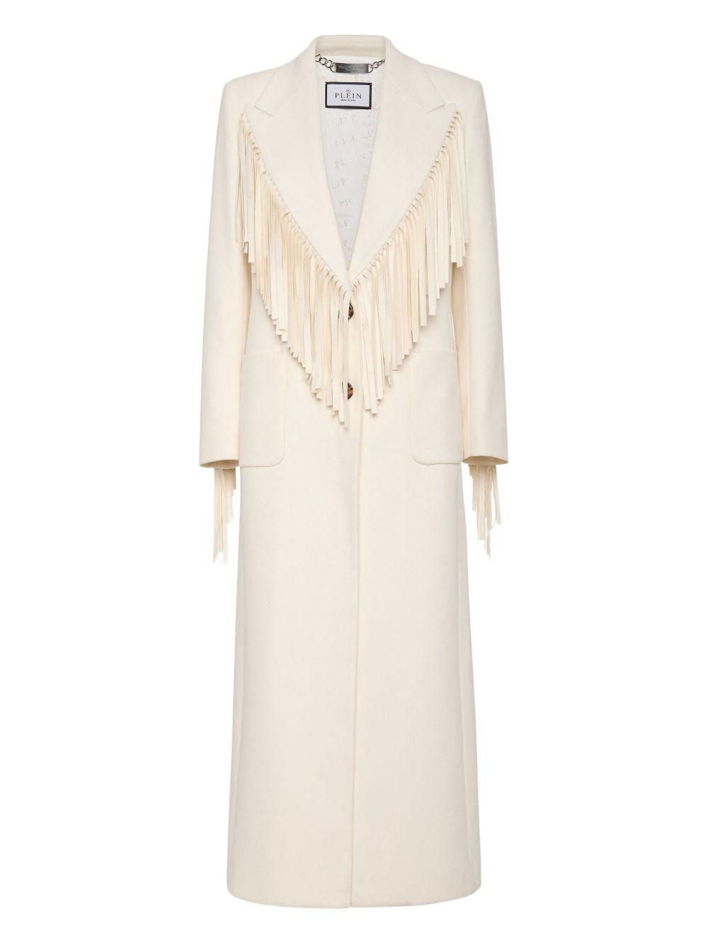 Plein Deluxe coat Highlights - Light beige - Front button fastening - Two front flap pockets - Embroidered logo - Fringe detailing Made in Italy Composition Fabric 100% Washing instructions Read Manufacturer Guidelines