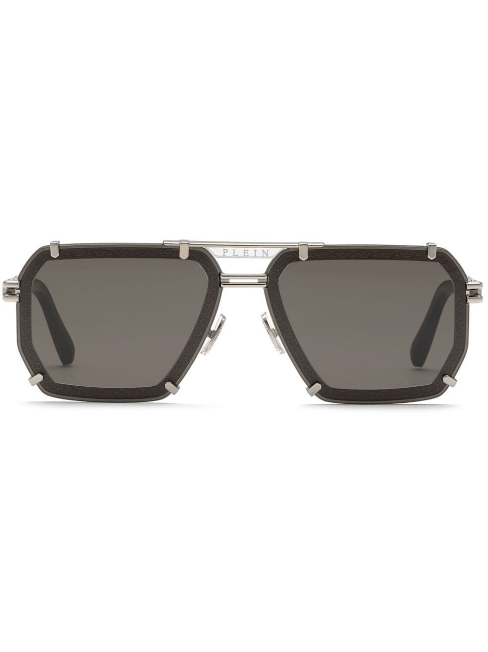 Plein Legacy sunglasses Highlights - Black - Metal - Pilot frame - Grey tinted lenses - Engraved logo - Double bridge - Nose pads - Rivet detailing - Straight arms - Curved tips - These glasses come with a protective case. Made in Italy Composition Metal 100% SIZE & FIT Measurement Arm Length 5.7 in(14.5 cm) Bridge Width 0.47 in(1.2 cm) Lens Diameter 2.51 in(6.4 cm)