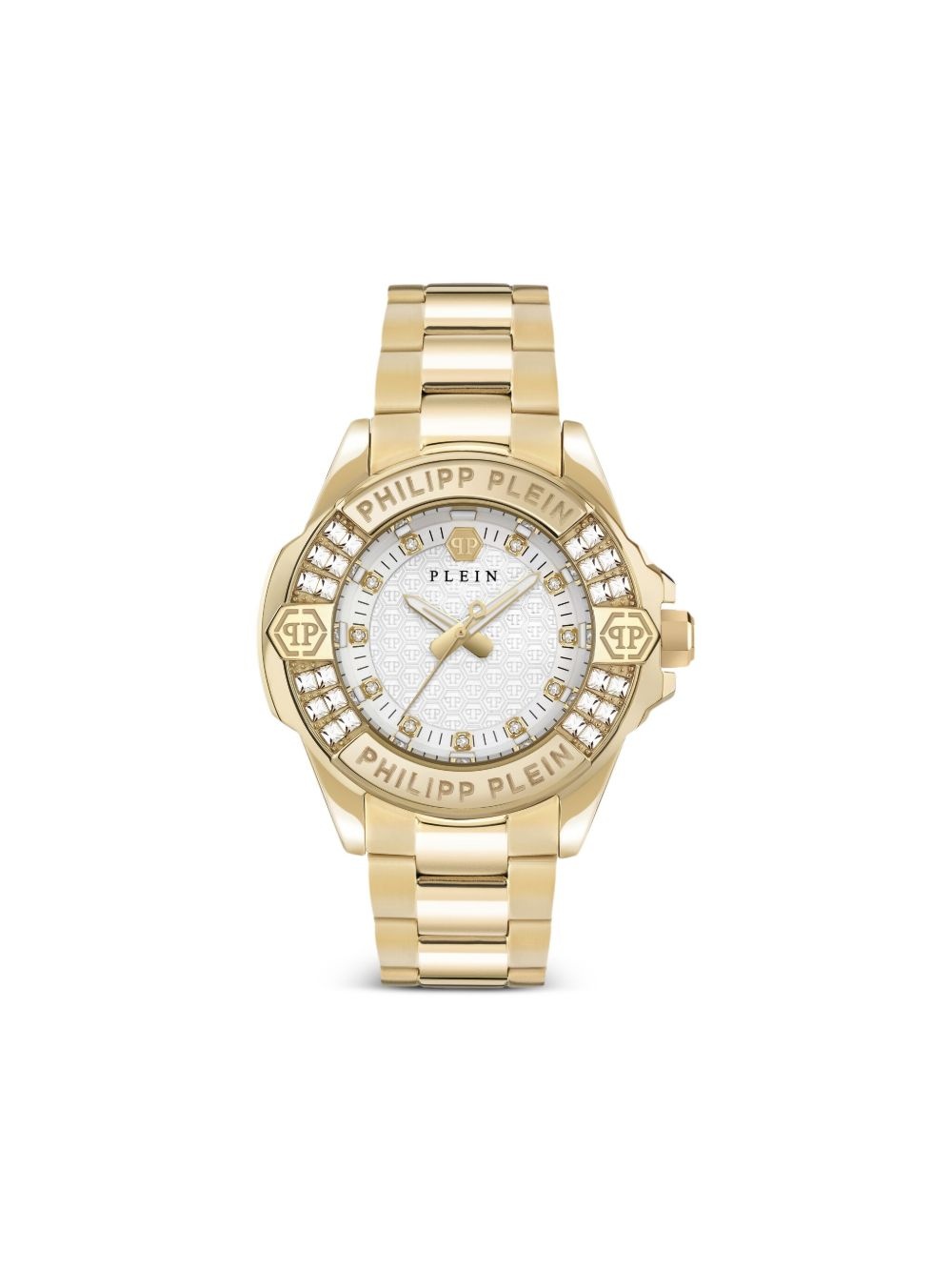 Plein Majesty 38mm Highlights - 38mm - White - Stainless steel - Guilloche dial - Crystal embellishment - Round face - Water resistance up to 50m/5 atm - Quartz movement - Deployant-clasp fastening Imported