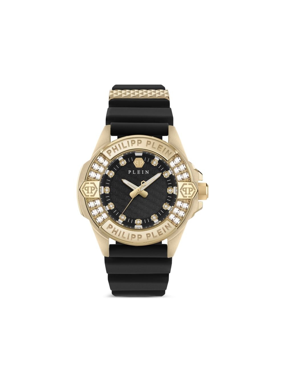 Plein Majesty 38mm Highlights - 38mm - Black - Round face - Guilloche dial - Crystal embellishment - Quartz movement - Water resistance up to 50m/5 atm - Ardillon-buckle fastening Imported