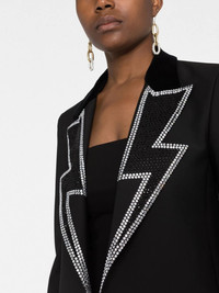 rhinestone cropped blazer black rhinestone embellishment notched lapels open front long sleeves cropped Made in Italy Composition Outer: Polyester 90%, Elastane 10% Lining: Viscose 100% SIZE & FIT Model measurements Height 5 ft 11 in(1.8 m) Bust/Chest 31.49 in(80 cm) Hips 36.61 in(93 cm) Waist 24.4 in(62 cm) FittingInformation This piece fits true to size. We recommend you get your regular size Cut for a loose fit Made with a mid-weight non-stretch fabric Washing instructions Dry Clean Only