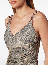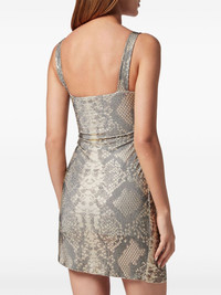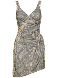 rhinestone-embellished mini dress Highlights - Sesame beige/multicolour - Snakeskin print - Rhinestone embellishment - Draped design - Gathered detailing - Silver-tone logo plaque - V-neck - Thin shoulder straps - Sleeveless - Fitted waistline - Thigh-length - High-low hem Imported Composition glass 100%, Polyester 95%, Elastane 5% SIZE & FIT FittingInformation Designed for a close fit throughout Made from a midweight stretch fabric, this piece offers elasticity and flexibility when worn