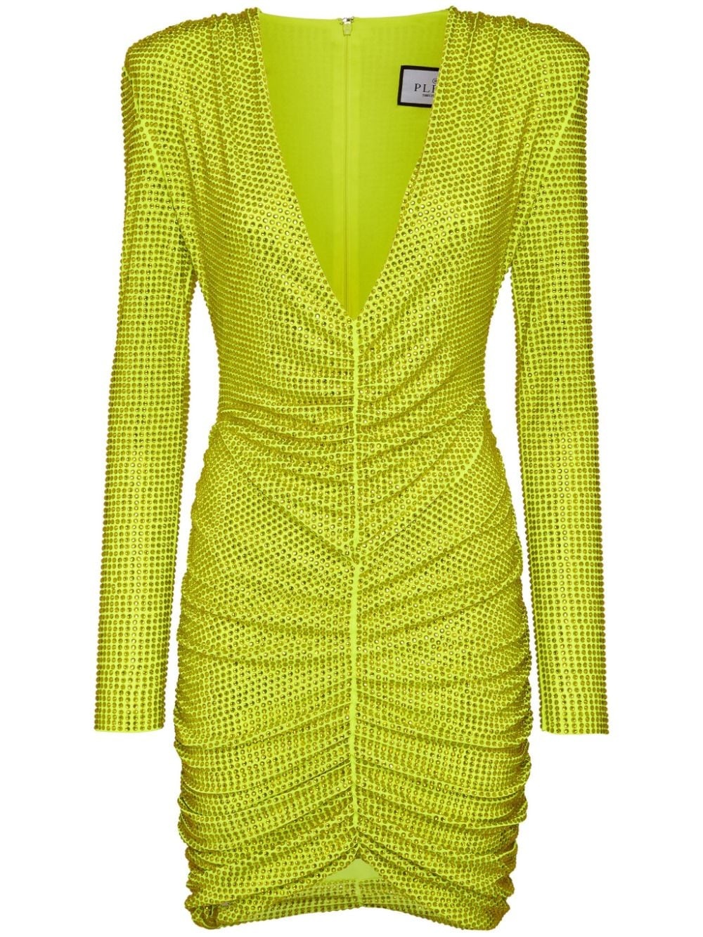 rhinestone-embellished ruched mini dress Highlights - Fluo yellow - Stretch-design - Rhinestone embellishment - Ruched detailing - Logo plaque to the side - Plunging v-neck - Shoulder pads - Concealed rear zip fastening - Long sleeves Imported Composition Polyester 93%, Elastane 7% Washing instructions Read Manufacturer Guidelines