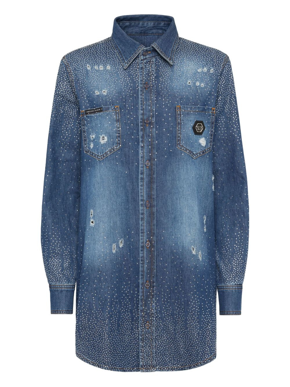 rhinestone-embellished shirt Highlights - Blue - Rhinestone embellishment - Distressed detailing - Long sleeves - Button fastening - Chest pockets Made in Italy Composition Fabric 100% Washing instructions Read Manufacturer Guidelines
