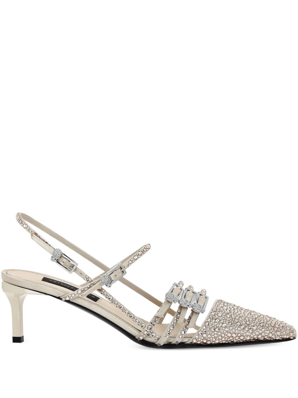 rhinestone-embellished slingback pumps Highlights - Beige - Pointed toe - Multi-strap design - Crystal detailing - Mid heel Made in Italy Composition Outer: Fabric 100%, glass 100% Sole: Calf Leather 100% Lining: Calf Leather 100%