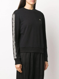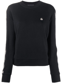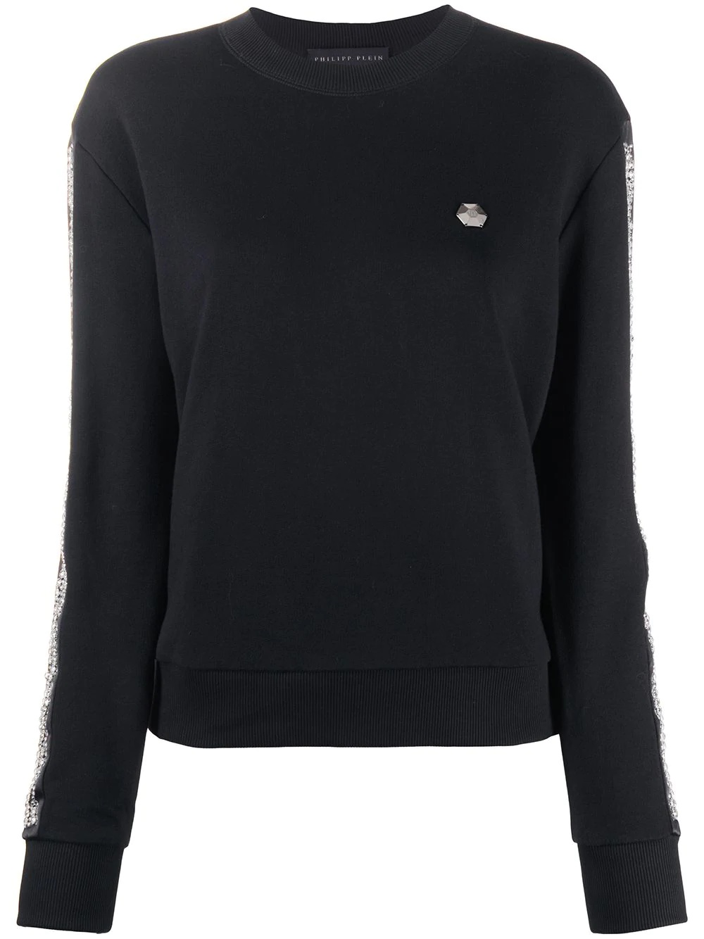 rhinestone-embellished stripe sweatshirt Black rhinestone-embellished stripe sweatshirt from Philipp Plein featuring a ribbed crew neck, a silver-tone logo plaque, long sleeves, applique stripes at the sides, rhinestone embellishments and a ribbed hem and cuffs. Made in Italy Composition Polyester 100%, glass 100% SIZE & FIT Model measurements Height 5 ft 11 in(1.8 m) Bust/Chest 33.07 in(84 cm) Hips 37.4 in(95 cm) Waist 25.19 in(64 cm) FittingInformation This piece fits true to size. We recommend you get your regular size Cut for a relaxed fit Made with a mid-weight fabric Washing instructions Hand Wash