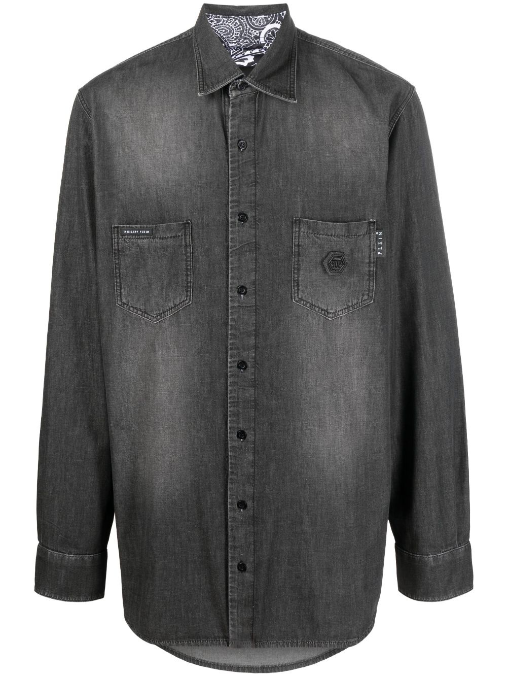 rhinestone skull-print denim shirt Highlights - Gunmetal grey - Cotton - Rhinestone embellishment - Skull print to the rear - Paisley print - Classic collar - Front button fastening - Long sleeves - Buttoned cuffs - Two chest patch pockets - Straight hem Imported Composition Polyester 100%, Cotton 100% SIZE & FIT Model measurements Height 6 ft 1 in(1.85 m) Bust/Chest 31.88 in(81 cm) Hips 33.07 in(84 cm) Waist 26.77 in(68 cm) FittingInformation Designed to be unstructured, offering a loose fit throughout Made from a midweight non-stretch fabric This piece fits true to size – take your usual size Washing instructions Dry Clean Only