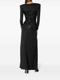 ruched lame-effect maxi dress Highlights - Black - Lame effect - Ruched detailing - Gathered detailing - Silver-tone logo plaque - Plunging v-neck - Concealed rear fastening - Shoulder pads - Long sleeves - Fitted waistline - Side slit - Long length - Straight hem - Leopard print lining Imported Composition Polyester 95%, Spandex/Elastane 5% Washing instructions Read Manufacturer Guidelines
