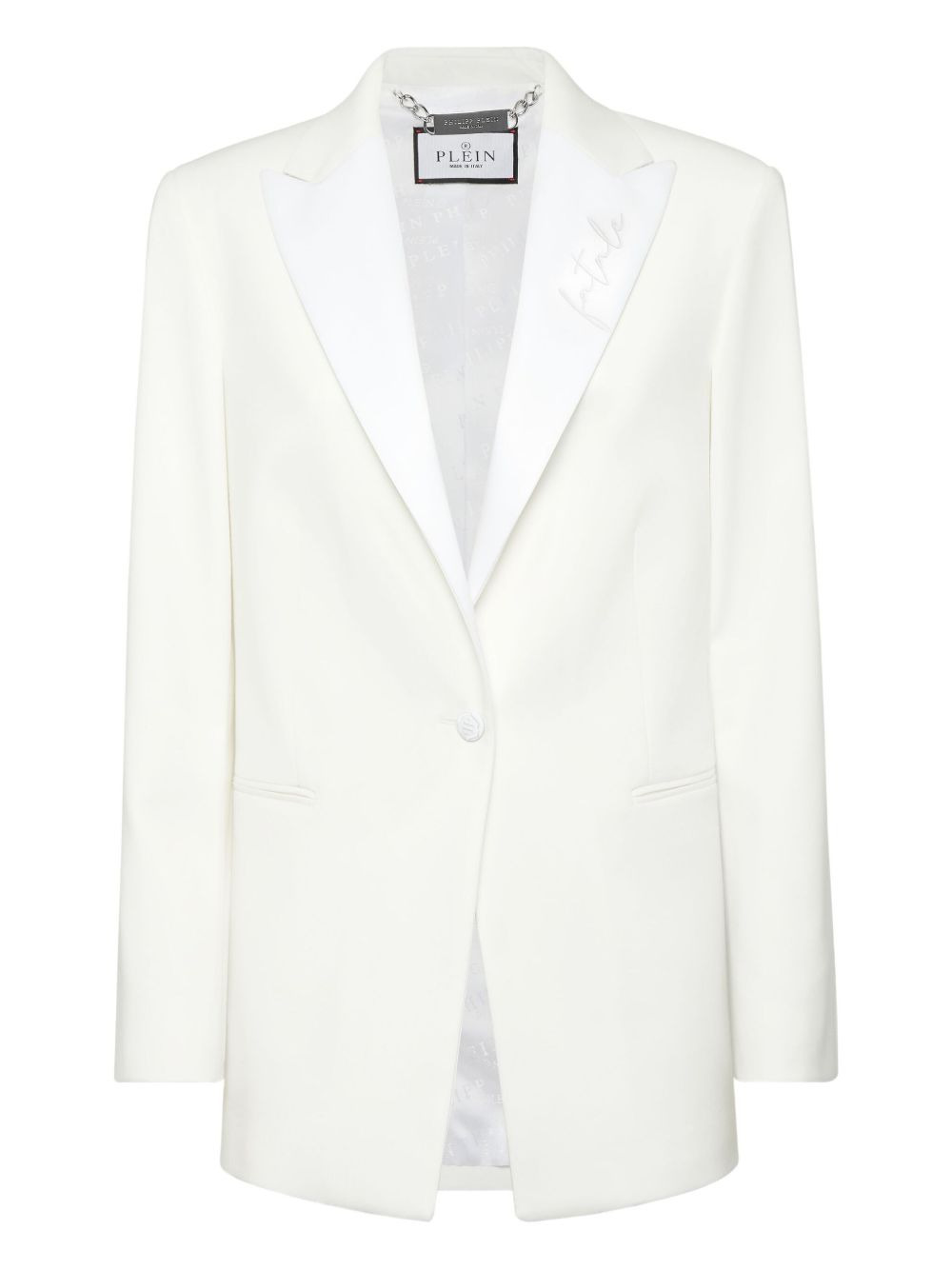 satin-lapels embroidered blazer Highlights - White - Satin lapels - Single button fastening - Embroidered lettering - Straight hem Made in Italy Composition Outer: Polyester 55%, Wool 45% Lining: Viscose 51%, Acetate 49% Washing instructions Read Manufacturer Guidelines