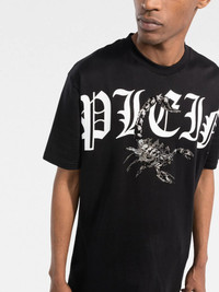 Scoprion logo-print T-shirt Channeling Philipp Plein's avant-garde style, this classic T-shirt is decorated with a studded scorpion motif on the front, blending in with the brand's recognisable logo. Imported Composition Cotton 100% SIZE & FIT Model measurements Height 6 ft 2 in(1.88 m) Bust/Chest 35.03 in(89 cm) Hips 35.82 in(91 cm) Waist 27.95 in(71 cm) FittingInformation This piece fits true to size. We recommend you get your regular size Cut for a relaxed fit Made with a mid-weight fabric Washing instructions Hand Wash