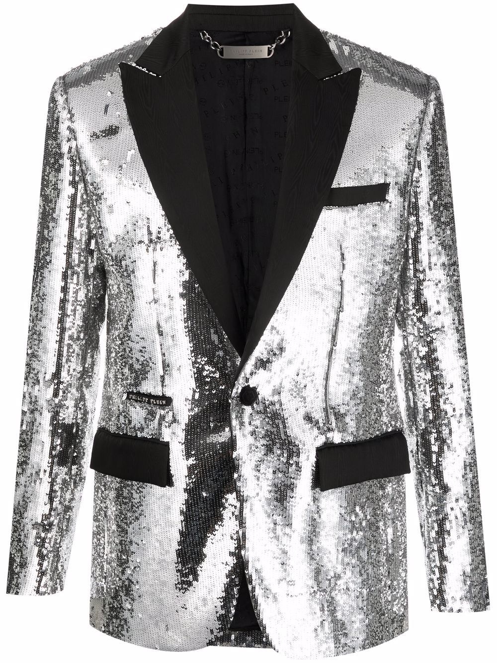 sequin-embellished single-breasted blazer silver/black sequin embellishment two side flap pockets front button fastening notched lapels long sleeves buttoned cuffs curved hem Made in Italy Composition Outer: Polyester 100% Lining: Viscose 51%, Acetate 49% SIZE & FIT Model measurements Height 6 ft 2 in(1.89 m) Bust/Chest 37.79 in(96 cm) Hips 37 in(94 cm) Waist 29.92 in(76 cm) Washing instructions Dry Clean Only