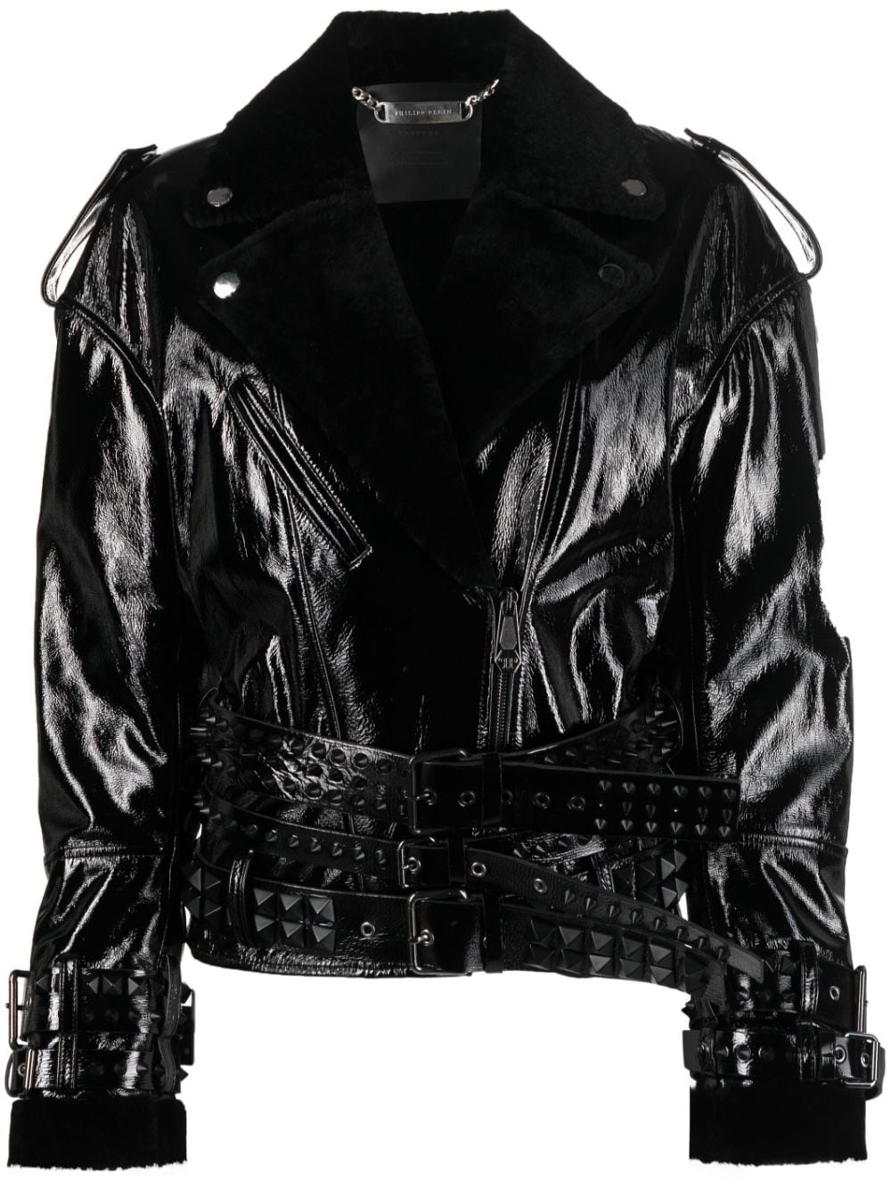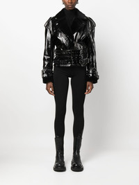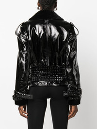 shearling-collar patent-leather jacket Highlights - Jet black - Calf leather - Patent finish - Silver-tone rockstud detailing - Shearling collar - Peak lapels - Off-centre front zip fastening - Belted waist - Drop shoulder - Long sleeves - Belted cuffs - Straight hem Imported Composition Calf Leather 100% SIZE & FIT Model measurements Height 5 ft 10 in(1.78 m) Bust/Chest 31.49 in(80 cm) Hips 37 in(94 cm) Waist 23.62 in(60 cm) FittingInformation Designed for a slim fit that sits just away from the body offering a close yet comfortable fit The belt offers adjustability for fitted preferences Firm shearling has a treated construction offering some durability This piece fits true to size – take your usual size Washing instructions Specialist Cleaning