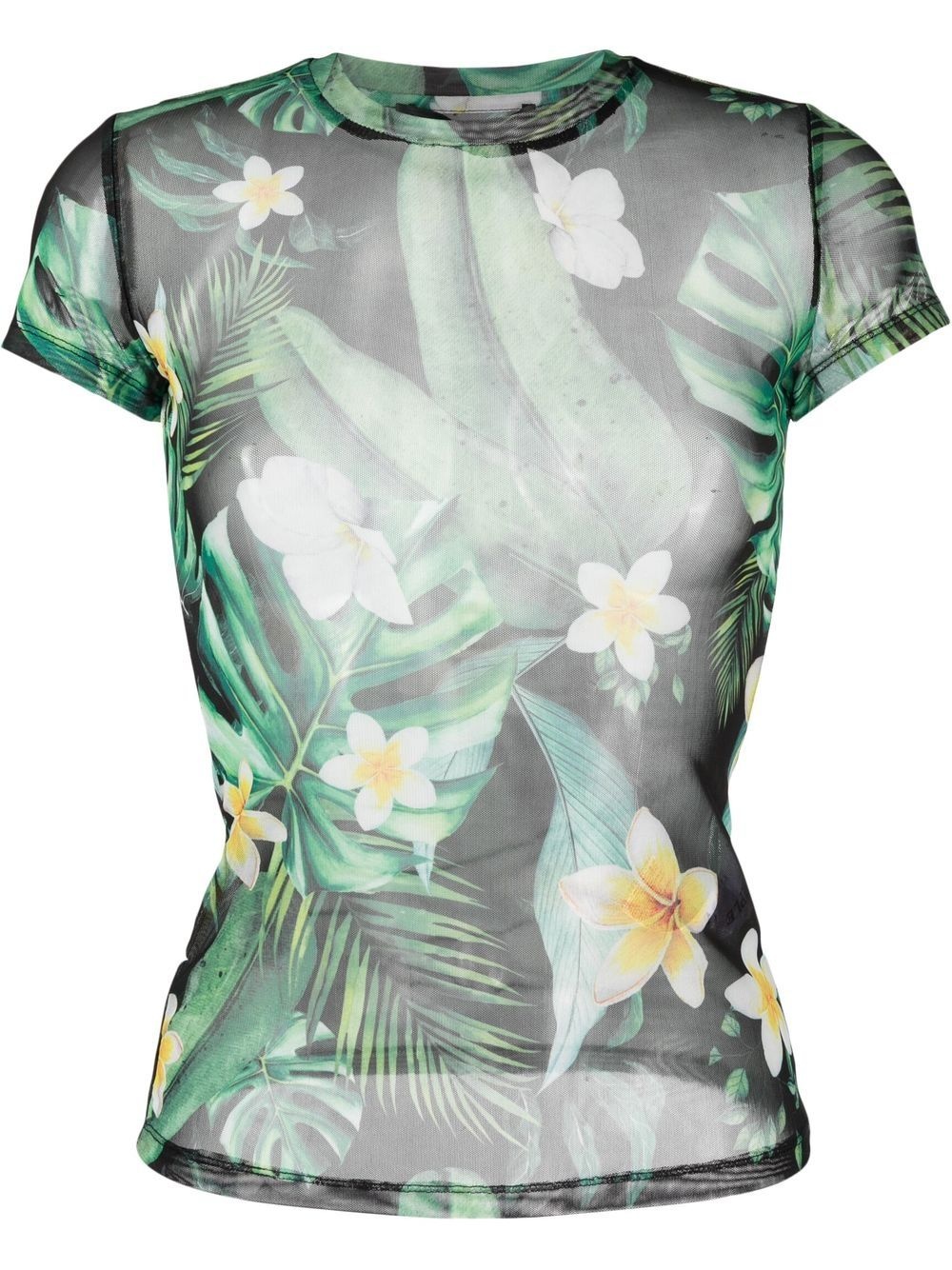 sheer graphic-print T-shirt dark green/multicolour stretch-cotton all-over graphic print semi-sheer construction short sleeves round neck straight hem Imported Composition Cotton 95%, Spandex/Elastane 5% Washing instructions Hand Wash