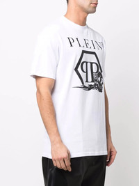 skull and logo-print T-shirt Reflecting the brand's rebellious aesthetic, Philipp Plein presents this T-shirt for SS22. Crafted from pure cotton, this T-shirt follows a classic silhouette and stands out thanks to its bold skull and logo print on the front. Highlights - White - Cotton - Round neck - Short sleeves - Straight hem - Skull print to the front - Logo print to the front - When buying this unisex item, keep in mind that it is graded in standard men's sizing. Imported Composition Cotton 100% SIZE & FIT Model measurements Height 5 ft 10 in(1.78 m) Bust/Chest 33.07 in(84 cm) Hips 36.61 in(93 cm) Waist 24.8 in(63 cm) FittingInformation This piece is unisex. Please take care when selecting your size Cut for a relaxed fit for both men and women Made with a mid-weight fabric Washing instructions Hand Wash