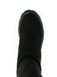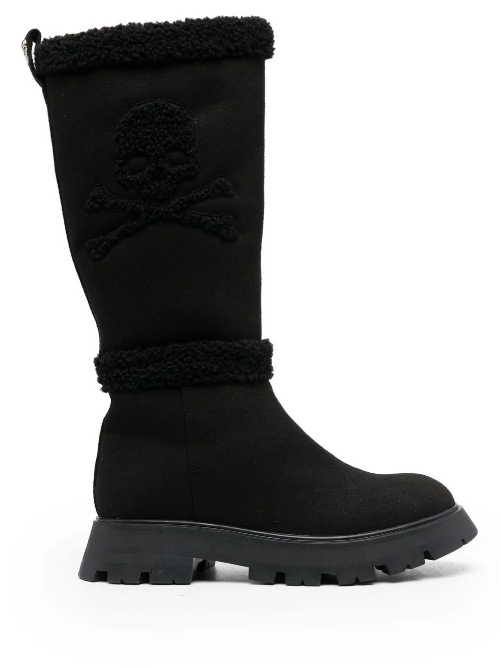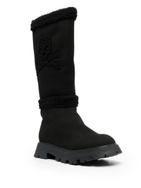 Skull Bones mid-calf boots black calf leather shearling lining skull applique round toe chunky rubber lug sole slip-on style pull-tab at the heel Imported Composition Sole: Rubber 100% Outer: Polyester 100% SIZE & FIT Measurement CIRCUMFERENCE 12.59 in(32 cm) HEEL 1.57 in(4 cm) HEIGHT 13.38 in(34 cm) Sole height 1.18 in(3 cm)