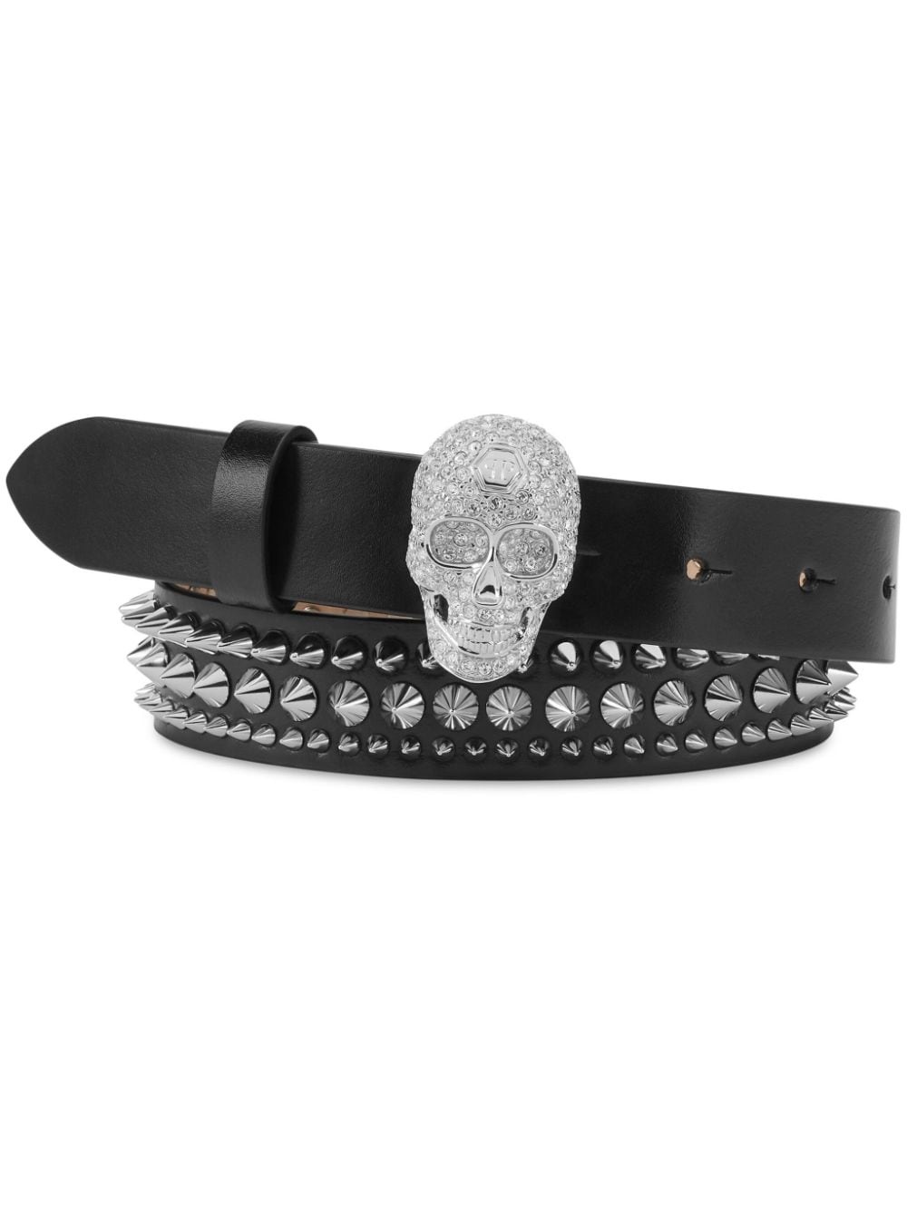 skull buckle leather belt Highlights - Black - Calf leather - Smoothing finish - Skull charm - Stud embellishment - Punch-hole detailing - Adjustable fit Made in Italy Composition Lining: Calf Leather 100% Outer: Calf Leather 100%, Plastic 100% SIZE & FIT Measurement WIDTH 1.18 in(3 cm)