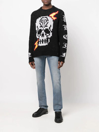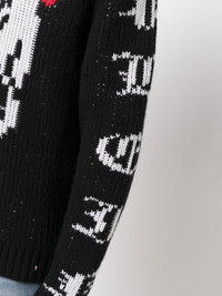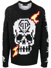 skull-detail knit jumper jet black intarsia knit skull print logo print at the sleeve round neck long sleeves straight hem Made in Italy Composition Outer: Lambs Wool 100% SIZE & FIT Model measurements Height 6 ft 2 in(1.88 m) Bust/Chest 36.61 in(93 cm) Hips 35.82 in(91 cm) Waist 27.95 in(71 cm) FittingInformation This piece fits true to size. We recommend you get your regular size Cut for a loose fit Made with a mid-weight fabric Washing instructions Dry Clean Only