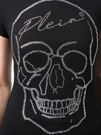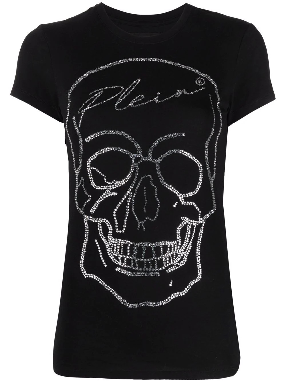 skull-detail short-sleeved T-shirt Philipp Plein's signature skull motif decorates the front of this black T-shirt with a studded finish. Crafted from soft cotton, it's cut to a slim fit and features a crew neckline and short sleeves. Imported Composition Cotton 100%, glass 100% SIZE & FIT Model measurements Height 5 ft 10 in(1.78 m) Bust/Chest 31.49 in(80 cm) Hips 36.22 in(92 cm) Waist 25.59 in(65 cm) FittingInformation This piece fits true to size. We recommend you get your regular size Cut for a slim fit Made with a mid-weight fabric Washing instructions Hand Wash