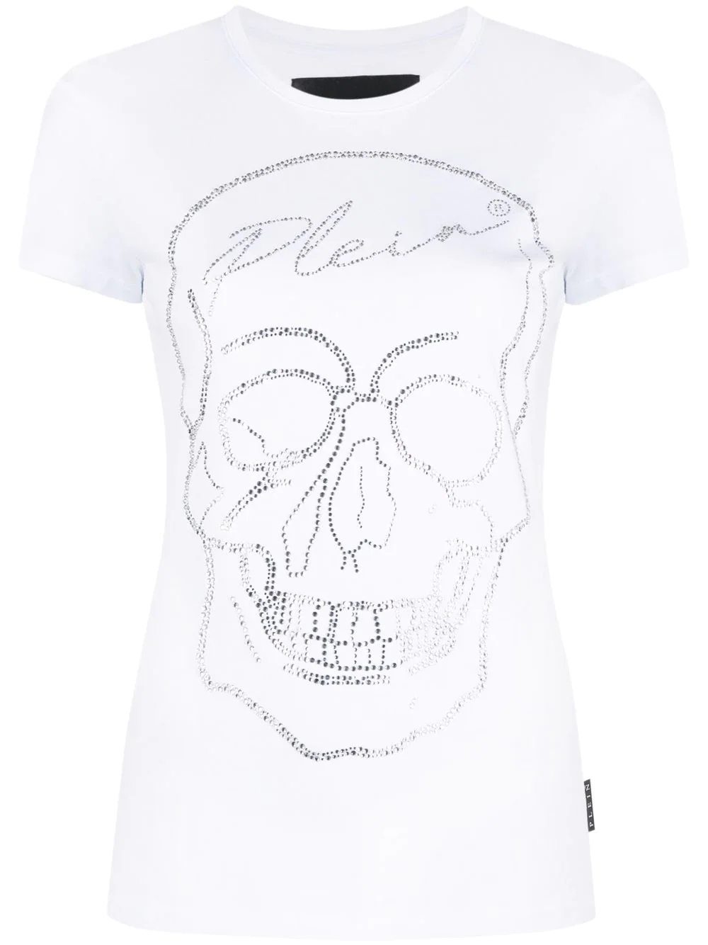 skull motif rhinestone-embellished T-shirt Philipp Plein's signature skull motif decorates the front of this white T-shirt with dazzling rhinestone embellishments. Crafted from soft cotton, it's cut to a slim fit and features a round neckline. Imported Composition Glass Fiber 100%, Cotton 100% SIZE & FIT Model measurements Height 6 ft 2 in(1.89 m) Bust/Chest 36.22 in(92 cm) Hips 37.79 in(96 cm) Waist 29.52 in(75 cm) FittingInformation This piece fits true to size. We recommend you get your regular size Cut for a slim fit Made with a mid-weight fabric Washing instructions Hand Wash