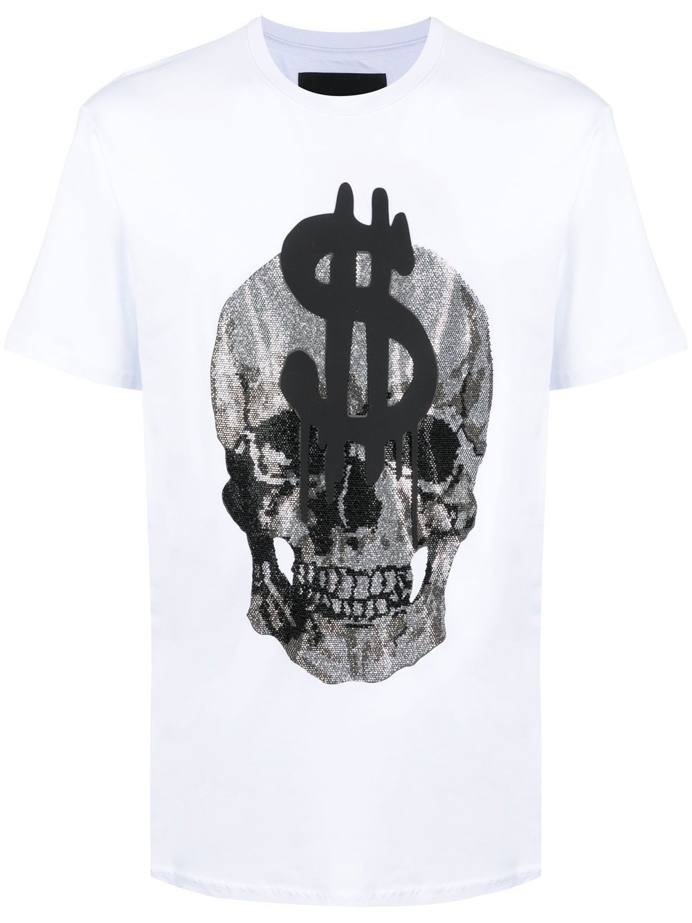 Skull-print crew-neck T-shirt white/black cotton skull print crew neck short sleeves Imported Composition Cotton 100%, Glass Fiber 100% SIZE & FIT Model measurements Height 6 ft 2 in(1.87 m) Bust/Chest 36.41 in(92.5 cm) Hips 37 in(94 cm) Waist 29.52 in(75 cm) FittingInformation This piece fits true to size. We recommend you get your regular size Cut for a slim fit Made with a mid-weight fabric Washing instructions Hand Wash