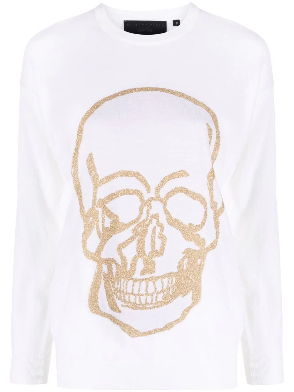 skull-print jumper white wool ribbed detailing skull print round neck long sleeves straight hem Imported Composition Wool 90%, Polyester 10% SIZE & FIT Model measurements Height 5 ft 9 in(1.75 m) Bust/Chest 32.67 in(83 cm) Hips 36.22 in(92 cm) Waist 24.8 in(63 cm) FittingInformation This piece fits true to size. We recommend you get your regular size Cut for a loose fit Made with a mid-weight fabric Washing instructions Hand Wash