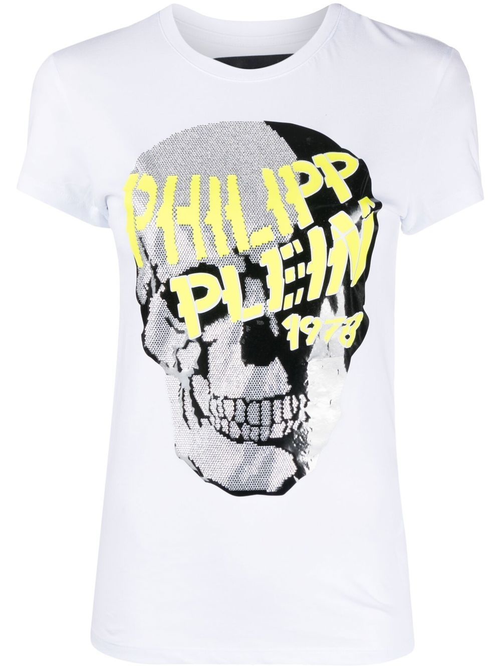 skull-strass v-neck T-shirt white cotton blend skull print logo print to the front crew neck short sleeves straight hem Imported Composition Glass Fiber 100%, Cotton 100% Washing instructions Hand Wash