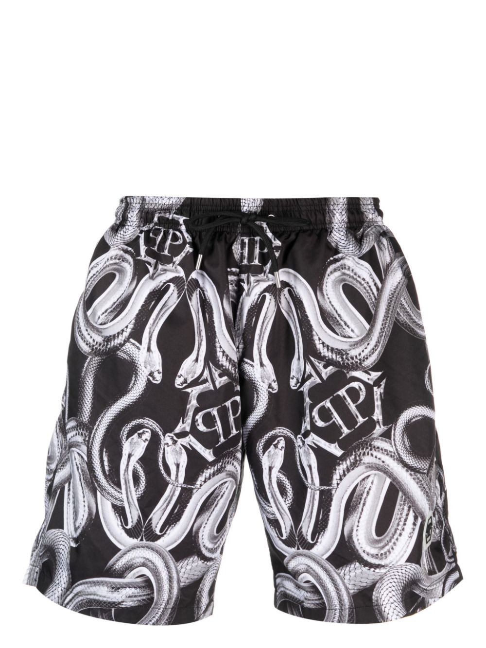 Snake logo-print swim shorts Highlights - Black/white - Cotton blend - All-over snakeskin print - Elasticated waistband - Rear welt pocket - Knee-length - Be mindful to try on swimwear over your own garments. Imported Composition Cotton 75%, Polyester 20%, Spandex/Elastane 5% Washing instructions Hand Wash