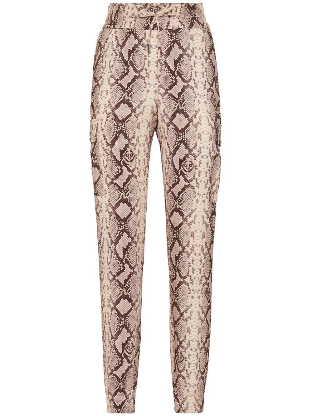 snakeskin-print satin cargo trousers Highlights - Archive beige/multicolour - Satin finish - Snakeskin print - Silver-tone logo plaque - High-waisted - Drawstring waist - Tapered leg - Side slit pocket - Two side cargo pockets - Two rear flap pockets Made in Italy Composition Outer: Viscose 97%, Elastane 3% Lining: Polyester 65%, Cotton 35%