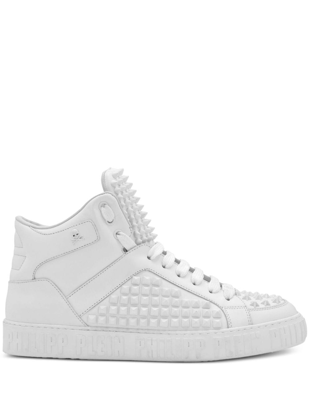 spike-effect mid-top sneakers Highlights - White - Leather - Spiked stud design - Skull charm - Ankle-length - Round toe - Front lace-up fastening - Flat rubber sole Made in Italy Composition Leather 100%