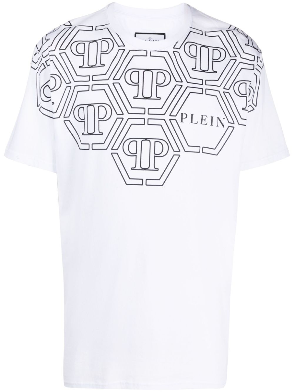 SS Hexagon round-neck T-shirt Highlights - Optical white - Cotton - Monogram print - Logo print at the chest - Silver-tone logo plaque - Round neck - Short sleeves - Straight hem Imported Composition Cotton 100%, Polyester 100% SIZE & FIT Model measurements Height 6 ft 2 in(1.87 m) Bust/Chest 36.41 in(92.5 cm) Hips 35.43 in(90 cm) Waist 29.52 in(75 cm) FittingInformation Designed for a relaxed fit, this piece allows for comfort and movement when worn Made from a midweight non-stretch fabric, this piece offers minimal elasticity when worn This piece fits true to size – take your usual size