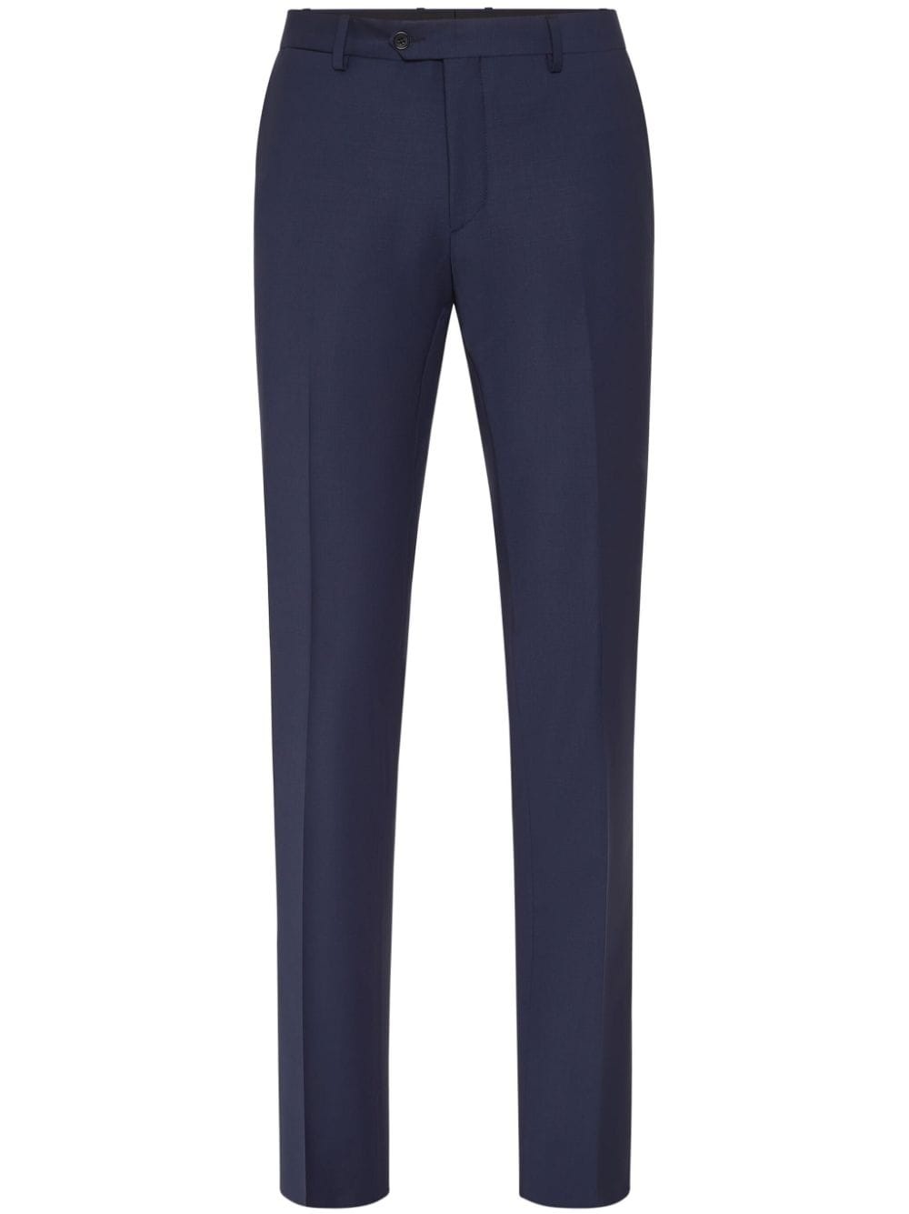 straight-leg wool-blend trousers Highlights - Navy blue - Cotton-wool blend - Tailored design - Logo patch to the rear - Mid-rise - Belt loops - Concealed fly and button fastening - Two side slit pockets - Two rear welt pockets Made in Italy Composition Outer: Polyester 53%, Virgin Wool 43%, Elastane 4% Lining: Polyester 65%, Cotton 35%
