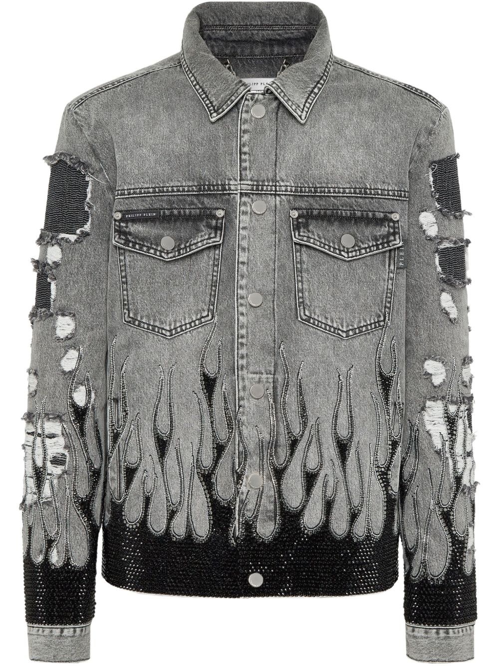 Strass Flame oversize denim jacket Highlights - Grey - Front button fastening - Two chest flap pockets - Rhinestone embellishment - Ripped detailing Imported Composition Outer: glass 100%, Cotton 100%, Polyester 100% Lining: Polyester 65%, Cotton 35%