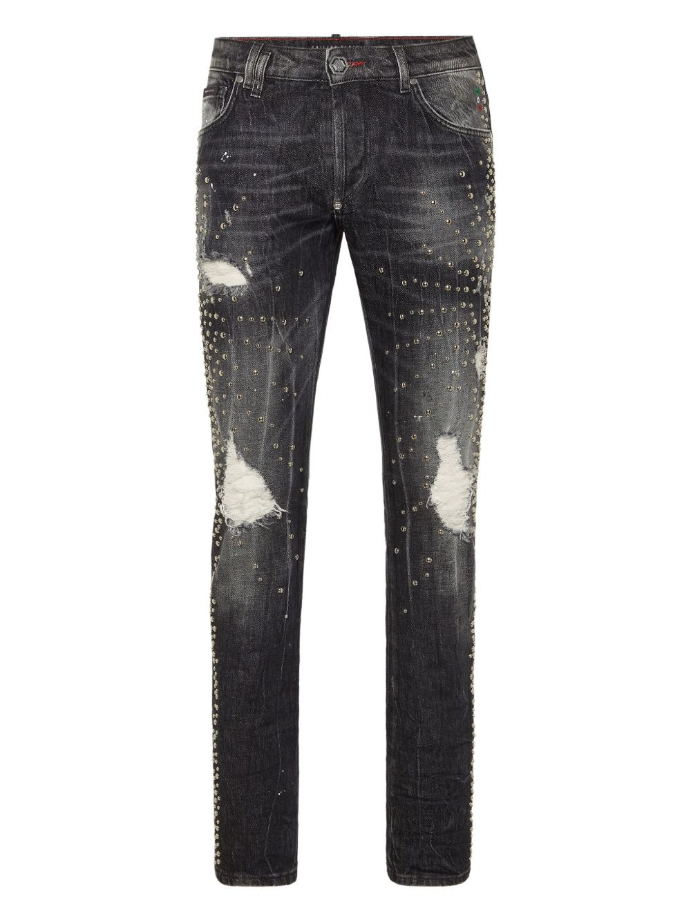 studded distressed jeans Highlights - Grey - Distressed detailing - Stud embellishment - Faded wash - Silver-tone studs Imported Composition Fabric 100% Washing instructions Read Manufacturer Guidelines